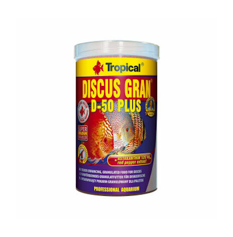 Tropical Discus D50Plus är ett sjunkande granulatfoder framtaget för Discus och andra fiskarter som livnär sig på en blandad föda. D50Plus har ett högt proteininnehåll och rikt på exogena aminosyror. Det är ett foder lämpligt för krävande arter. Inte minst Discuscikliden. Fodret är berikat med Beta-glukan som hjälper och förstärker fiskarnas immunsystem. Fodret är också berikat med det färgförstärkande medlet, Astaxhantin. D50Plus har visat sig ha en gynnsam effekt på fiskars lekbeteende.